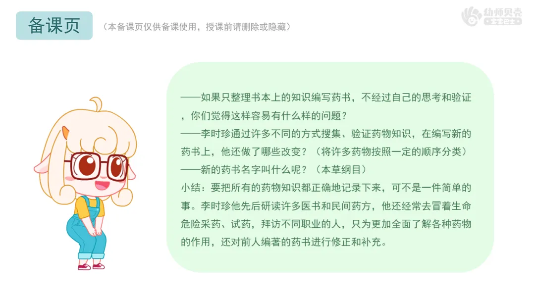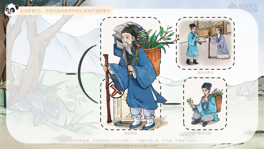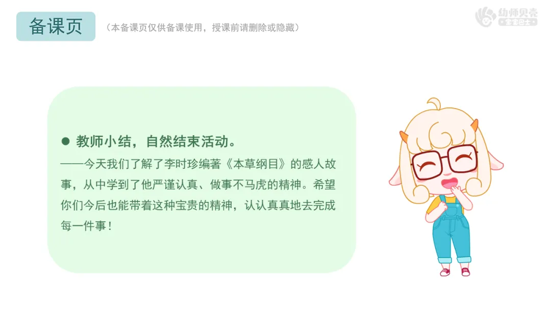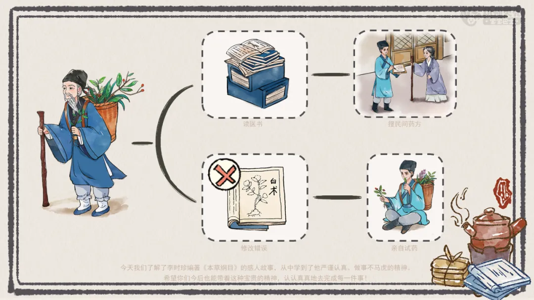 ——今天我们了解了李时珍编著《本草纲目》的感人故事,从中学到了他严谨认真、做事不马虎的精神。希望你们今后也能带着这种宝贵的精神,认认真真地去完成每一件事!