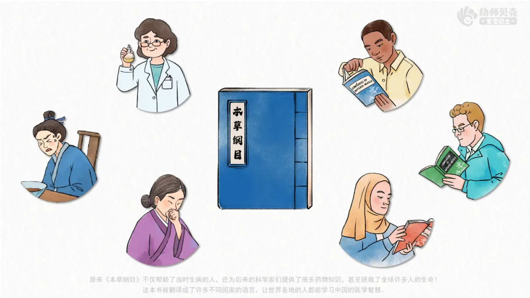 小结:原来《本草纲目》不仅帮助了当时生病的人,还为后来的科学家们提供了很多药物知识,甚至拯救了全球许多人的生命!这本书被翻译成了许多不同国家的语言,让世界各地的人都能学习中国的医学智慧。