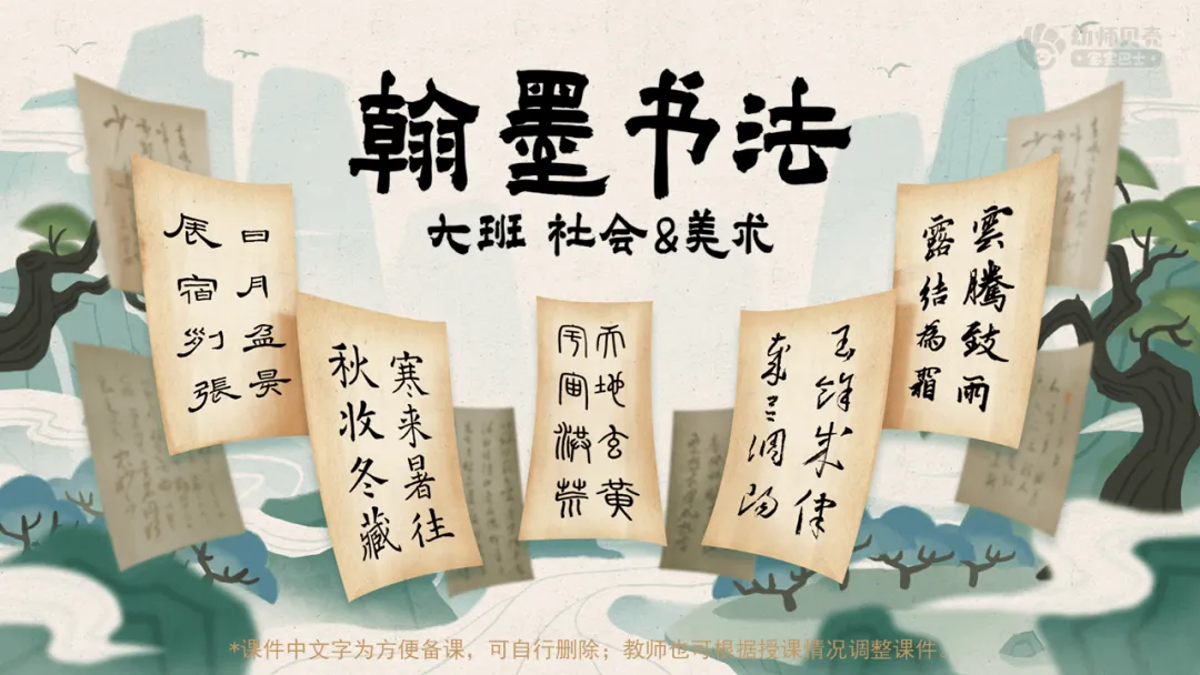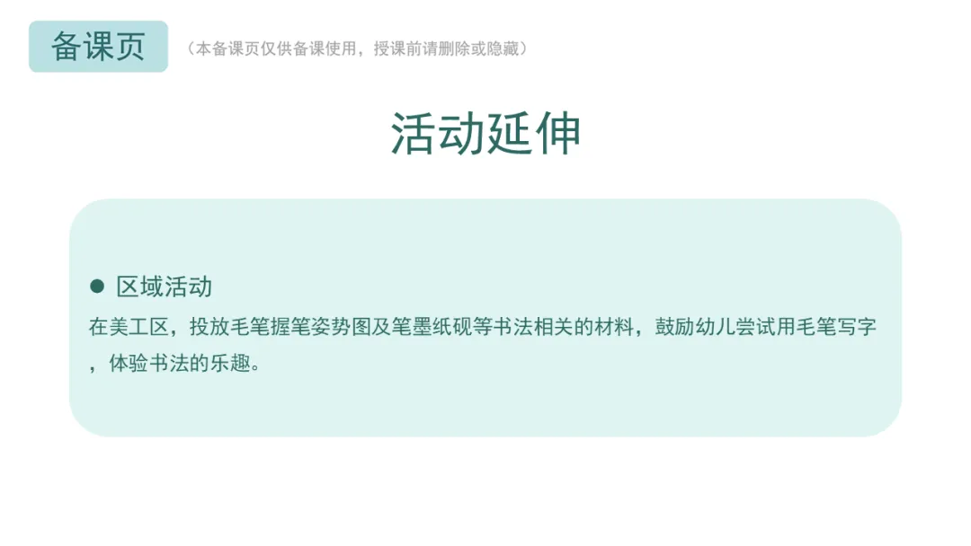 l书法配套活动方案《小小书法家》,内含毛笔握笔姿势图、精美国风书法底板等丰富的区角及环创资源,教师可在“幼师贝壳”APP上阅览下载,并根据情况带领幼儿学写毛笔字,共同进行环境创设。