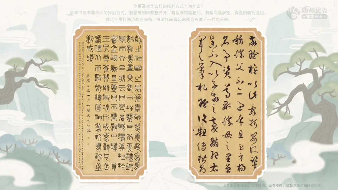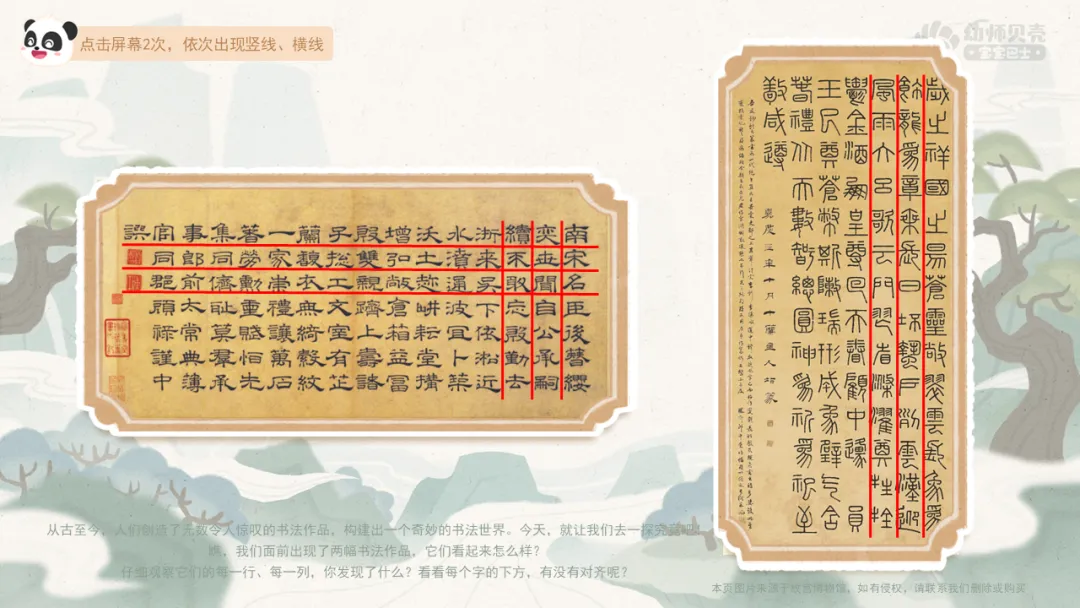 ——瞧,我们面前出现了两幅书法作品,它们看起来怎么样?仔细观察它们的每一行、每一列,你发现了什么?看看每个字的下方,有没有对齐呢?