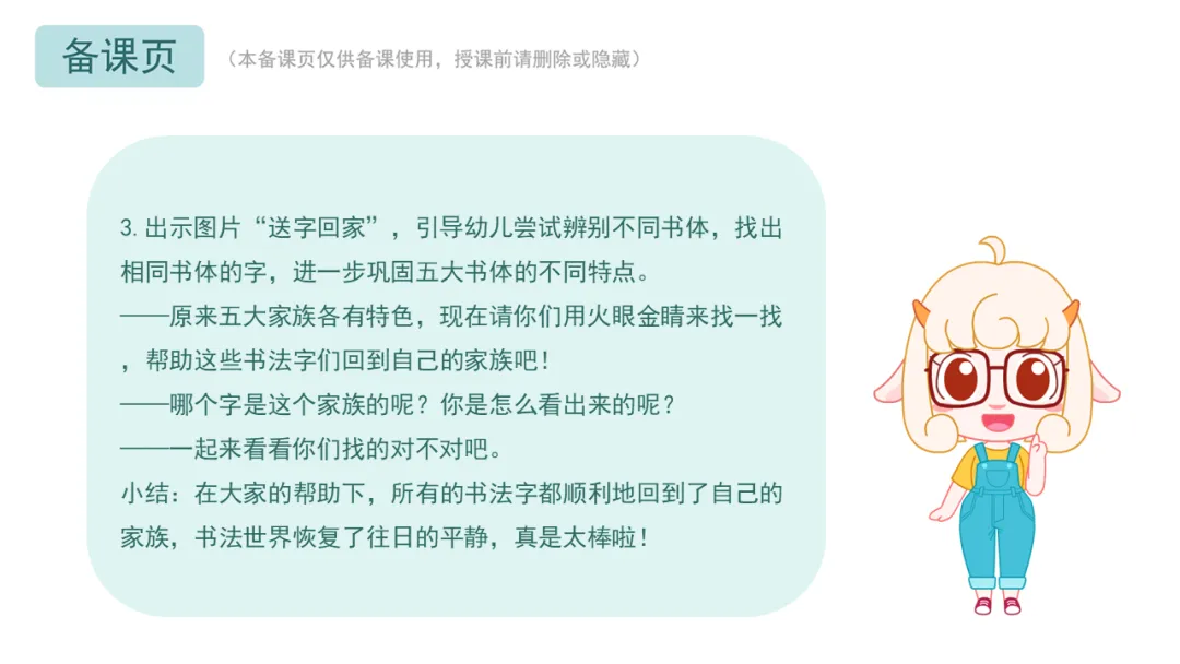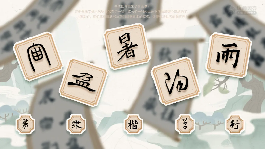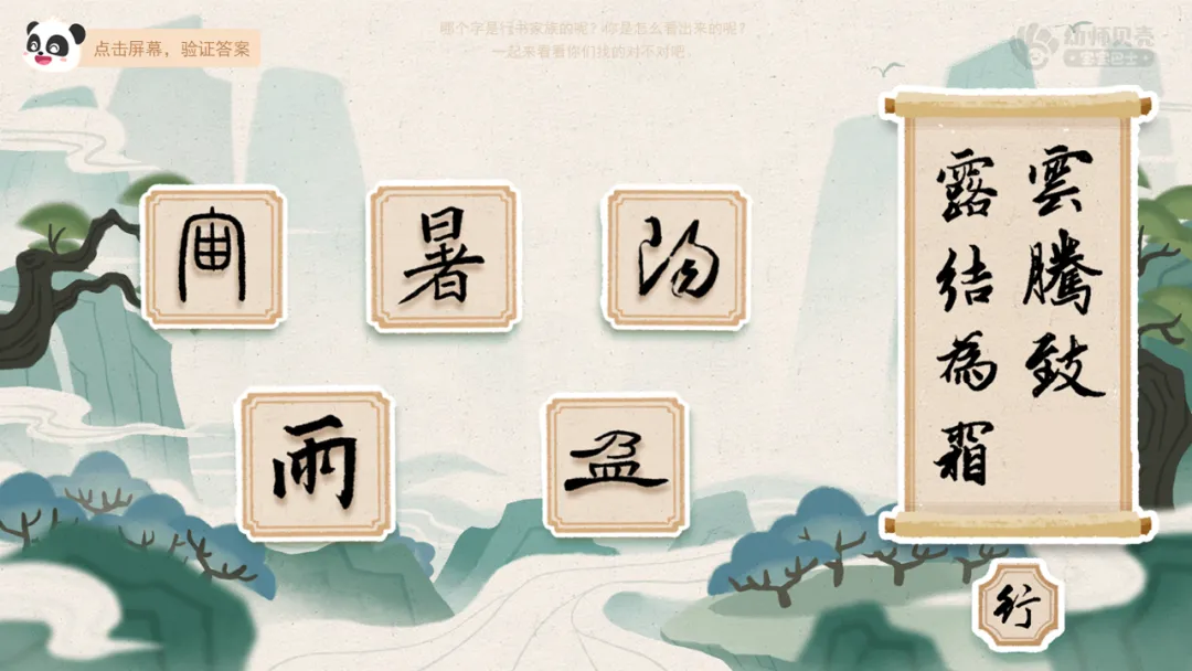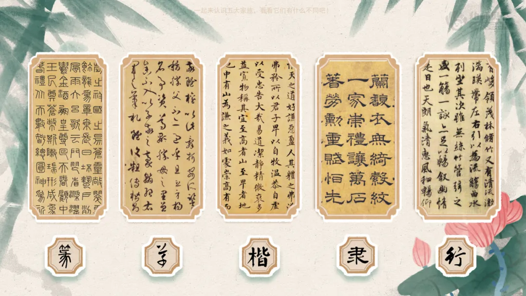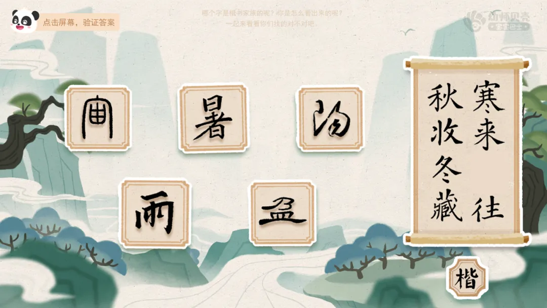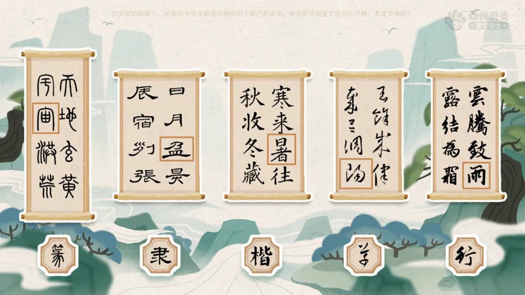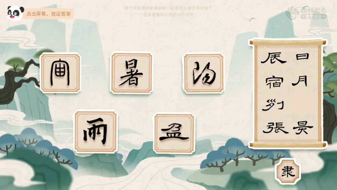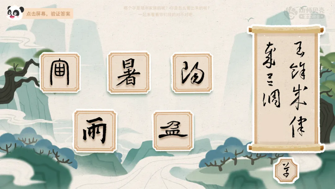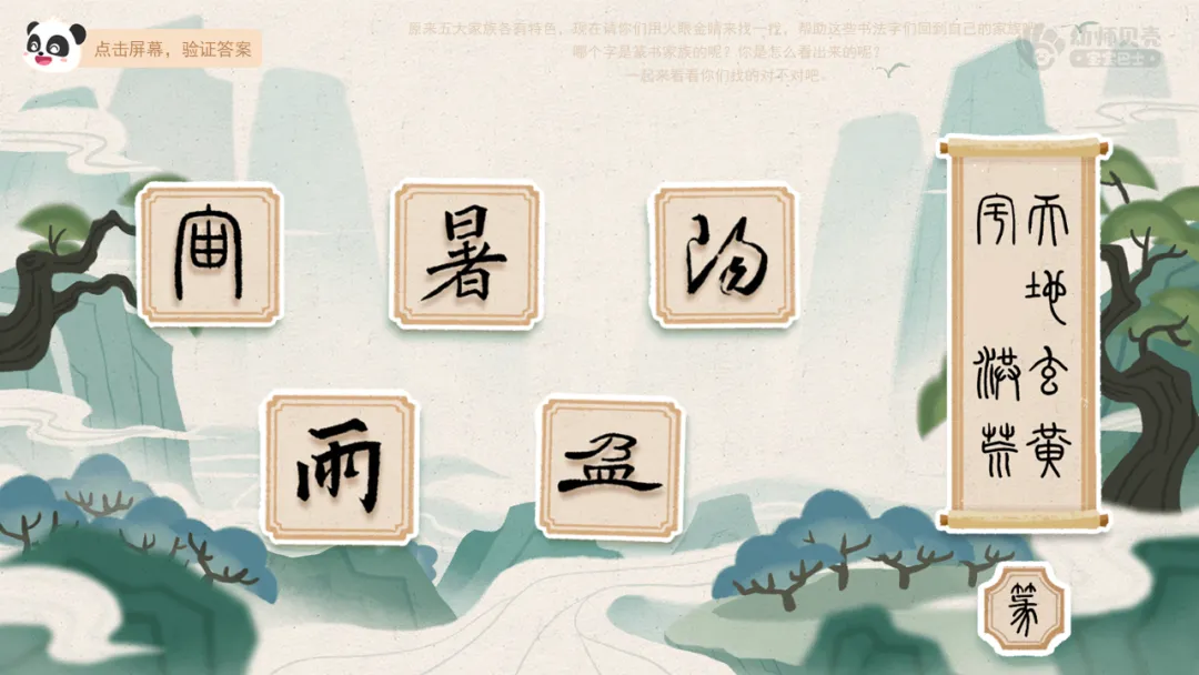 ——原来五大家族各有特色,现在请你们用火眼金睛来找一找,帮助这些书法字们回到自己的家族吧!