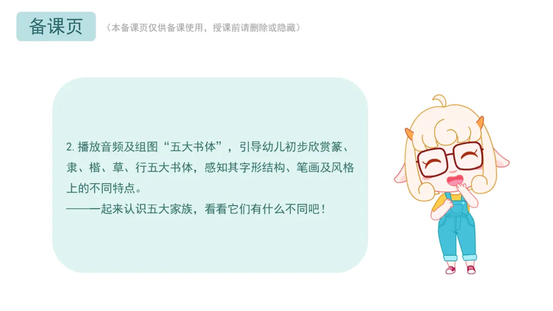 2.播放音频及组图“五大书体”,引导幼儿初步欣赏篆、隶、楷、草、行五大书体,感知其字形结构、笔画及风格上的不同特点。