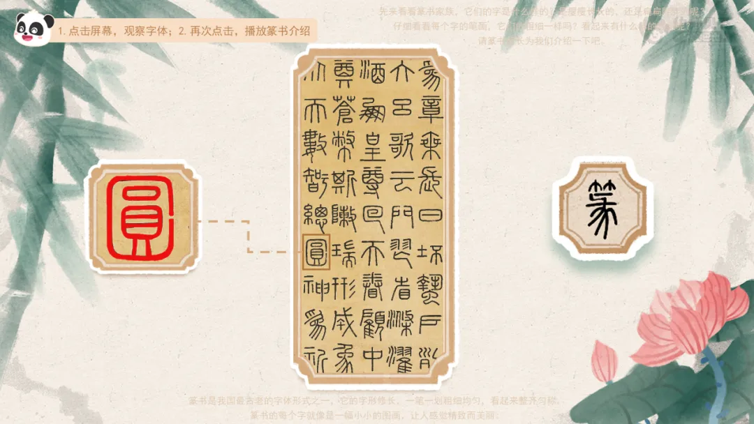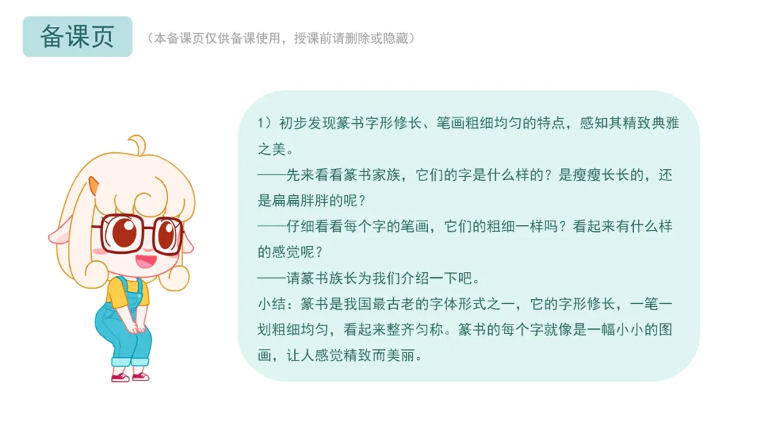 1)初步发现篆书字形修长、笔画粗细均匀的特点,感知其精致典雅之美。