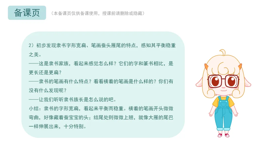 2)初步发现隶书字形宽扁、笔画蚕头雁尾的特点,感知其平衡稳重之美。