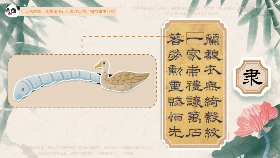 小结:隶书的字形宽扁,看起来平衡而稳重。横着的笔画开头微微弯曲,好像藏着蚕宝宝的头;结尾处则微微上翘,就像大雁的尾巴一样伸展出来,十分特别。