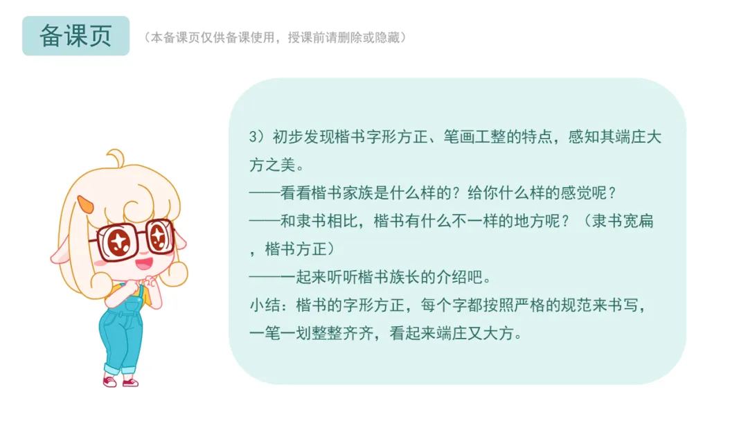 3)初步发现楷书字形方正、笔画工整的特点,感知其端庄大方之美。