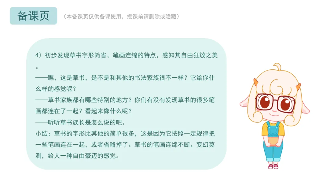 4)初步发现草书字形简省、笔画连绵的特点,感知其自由狂放之美。