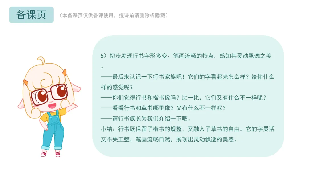 5)初步发现行书字形多变、笔画流畅的特点,感知其灵动飘逸之美。