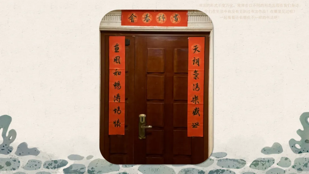 ——书法的形式千变万化,常常会以不同的形态出现在我们身边。你们在生活中有没有见到过书法作品?在哪里见过呢?