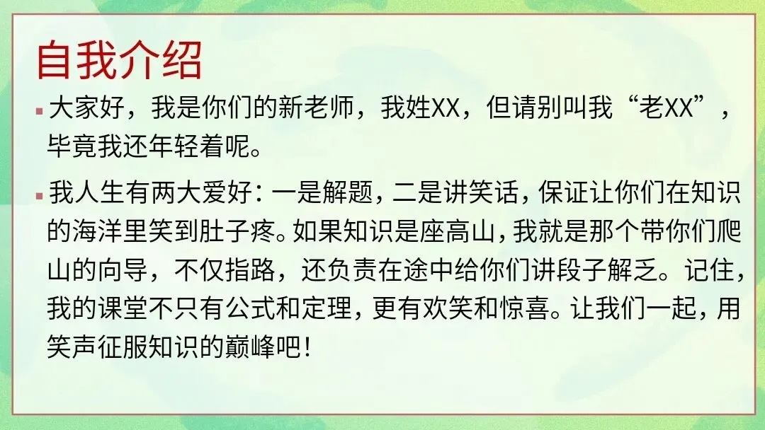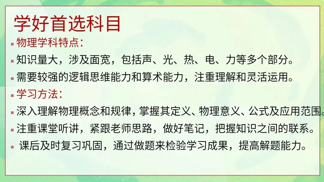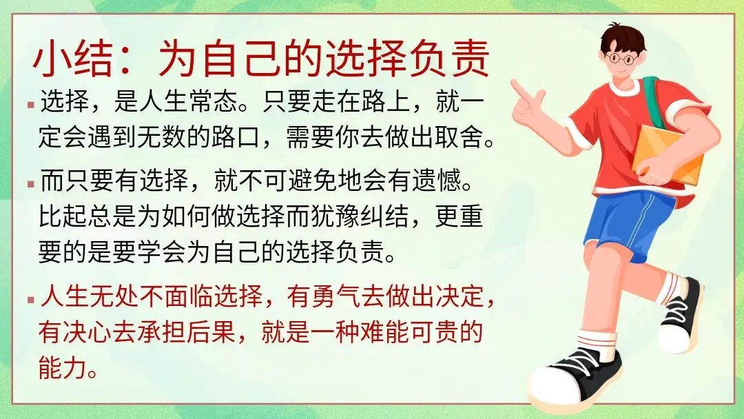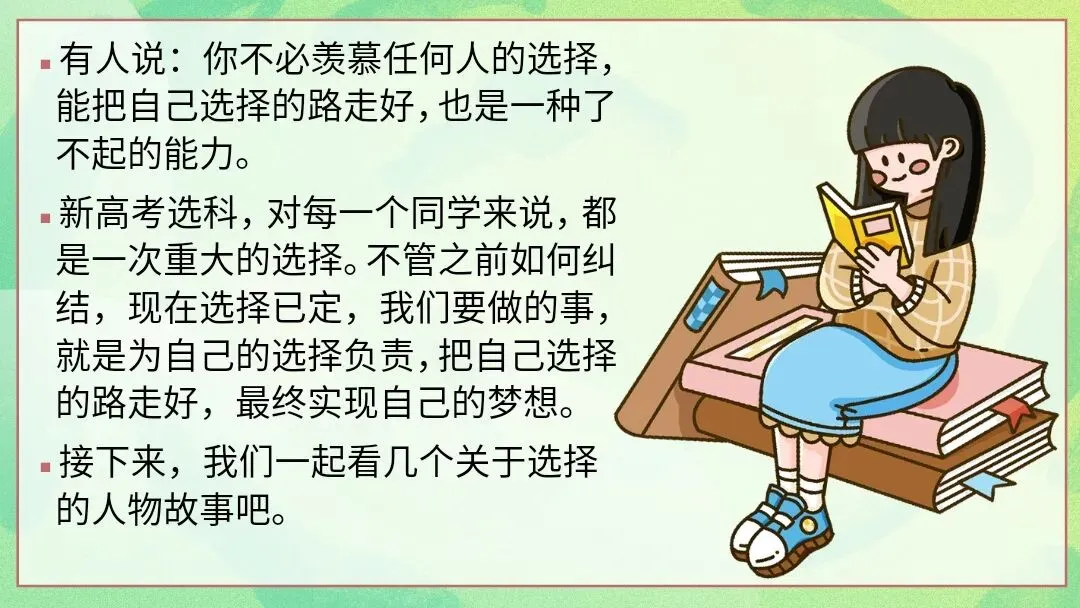 该PPT是选科分班后第一次班会课课件,围绕“选你所爱,爱你所选”展开。先通过破冰游戏帮助师生、同学相识;再以钱学森等人物事例强调为选择负责;接着解读新高考“3+1+2”模式,给出各科学习指导;然后分享让生活向上的5个建议与坚持做的5件事,引导学生自信、自律、专注;最后寄语学生珍惜缘分、共同努力,以歌曲《去远航》收尾,助力开启新学习旅程。