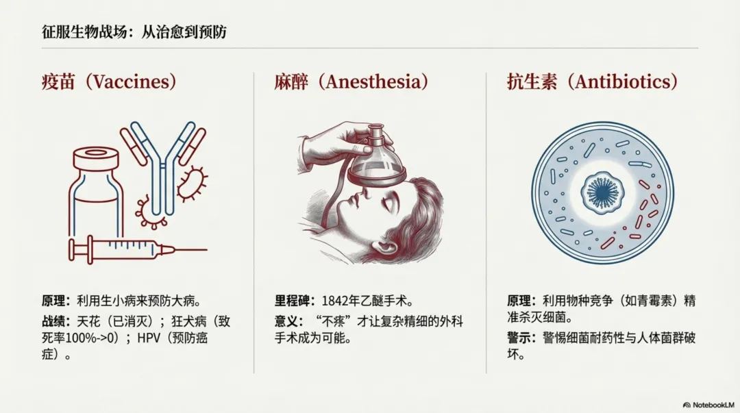 前篇《医学通识讲义》上篇:提升医药认知水平,从无知、无力到家庭健康主人我们科学理解了症状、疾病、医学、医院、医疗活动的实质,重新认识了一些需要特殊理解的“疾病”,帮我们建立了科学的“医学世界观”。本篇则带我们学习疾病的治疗防治技术演变过程,深入“医学的方法论,涵盖了人类如何利用技术对抗自然(疫苗、麻醉、抗生素),如何利用逻辑对抗不确定性(循证医学、决策),以及医生的精进、患者需要培养的智慧。如果你对以下话题感兴趣,欢迎关注讨论: