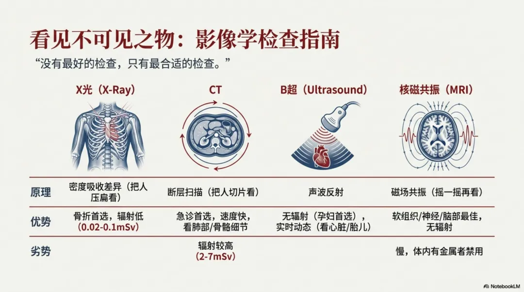 X射线(X光) | 利用X射线穿透人体,不同密度组织吸收程度不同:骨骼等高密度组织吸收多呈白色,肺/脂肪等低密度组织吸收少呈黑色 | 生成二维平面图像,相当于把人体"压扁"观察,存在组织重叠干扰 | 有电离辐射,剂量低(胸片约0.02-0.1mSv) |