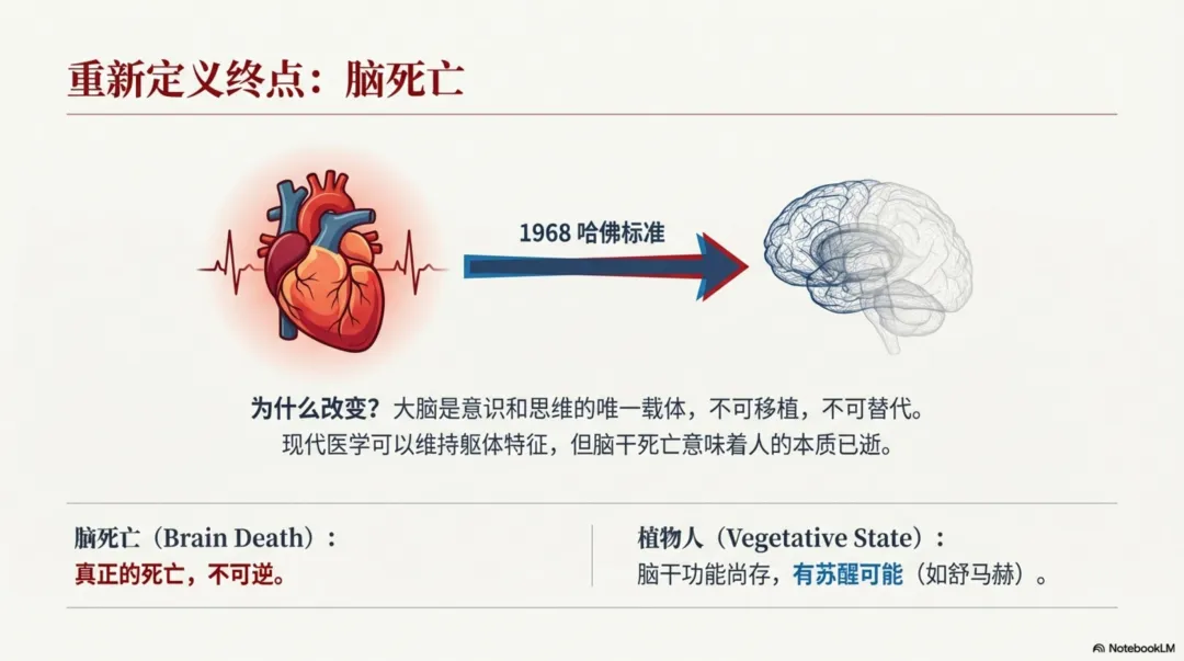 大多数人认为,生命的终点就是心脏停了,没有呼吸了。但是这种看法是错误地混淆了生命体征与生命的关系。人的基本生命体征包括呼吸、血压、脉搏、体温。那么又生命体征就一定代表着生命还在吗?并不是,1968年美国哈弗医院制定出人类历史上第一个脑死亡诊断标准:包括不可逆的昏迷、无自主呼吸、脑干反射全部消失和脑电波消失。符合以上标准并在一定时间反复测试、多次检查,结果无变化即可宣告病人脑死亡。一旦被诊断脑死亡,说明病人已经死亡。为什么用脑死亡作为死亡诊断标准呢?因为脑死亡比之前将心跳、呼吸停止作为死亡诊断的标准更科学。