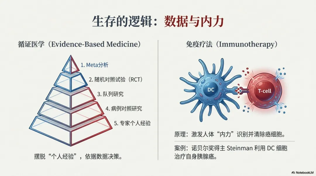 世界上有不计其数的医院和医生,那么对同一种疾病,不同医生会不会给出不同的治疗意见呢?答案是“会”。桥水基金瑞达利欧体检时发现食管出了问题,先后找了多位专家,有人说没有好的治疗办法,3-5年后可能癌变;有人说手术切除可以避免癌变,成功率90%。之后找了第三、四、五位专家建议每三个月复查一次即可,活检后发现虚惊一场。普通人无法享受到者多知名专家的诊断。循证医学就是“证据+经验+患者意愿”结合起来为病人制定治疗方案。循证医学的五级证据:第一级最可信,可行度依次递减。