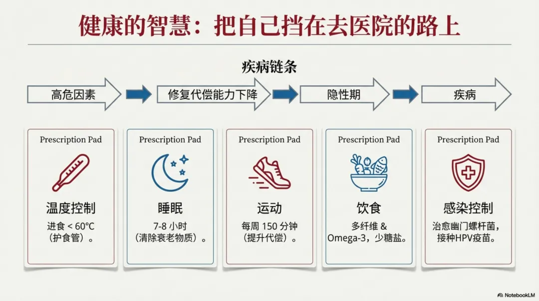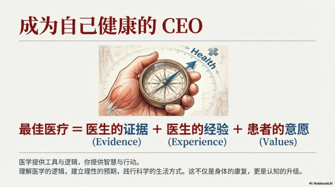 3)医生如何保持精进?三个核心关卡:少即是多、在信息不完备情况下快速决策、客服不理性的冲动。病人修炼提升健康水平?避免高危-保护机体自我修复代偿能力-早期筛查