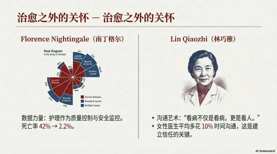 19世纪克里米亚战争中,在英军有军医没有专业护士的的情况下,伤员死亡率在42%以上。有了专业护士之后,伤员死亡率迅速下降到2.2%。创造这一奇迹的开创者就是护理事业创始人南丁格尔,她用“玫瑰图”扇形分析战场士兵死亡的原因。护理是决定医疗质量的关键因素,霍金被确诊渐冻症后,存活了56年,她的特效药就是一支高效的护理团队。