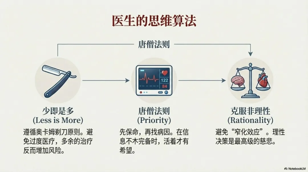 医生在治疗病人时,需要正确转换自己的理性思维和不理性思维。不理性会导致窄化效应,会让医生过度关注某一诊断,从而忽略其他线索;不理性会让医生过度关注疾病最坏的结局,变得激进和冒险,忽视了疾病发展规律。理性让医生在关键时刻正确判断,正确行事,而情感让医学有了色彩和温度。