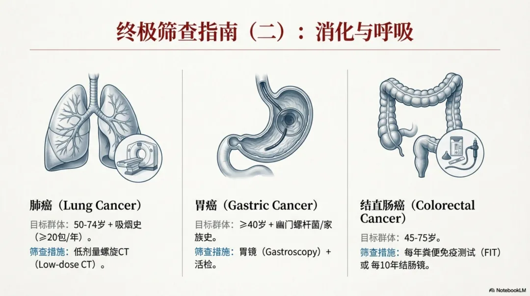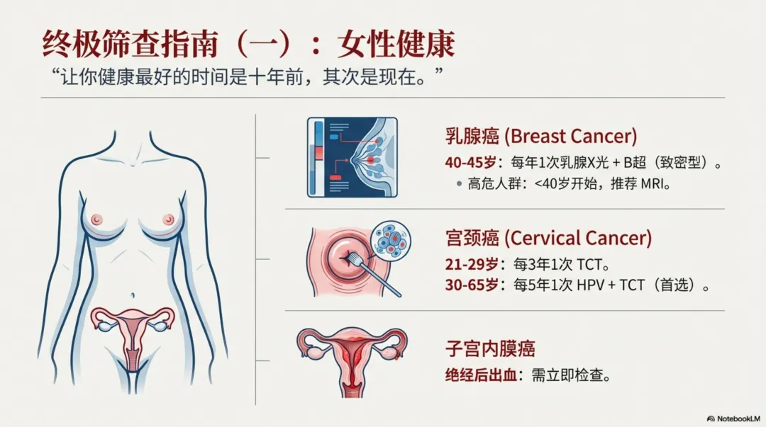 3)进行疾病早期筛查:让你健康的最好时间是十年前,其次是现在。以下四种癌症建议优先筛查:肺癌、乳腺癌、宫颈癌、结肠癌和直肠癌。筛查年龄和频率详见下图: