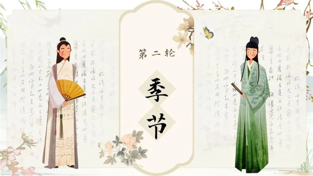 1.开展“飞花令”游戏,第一轮请学生说说含有“春”字的诗句,第二轮说出有关季节的诗句。