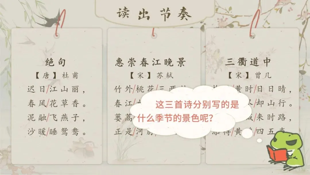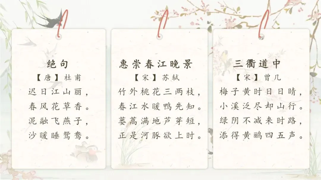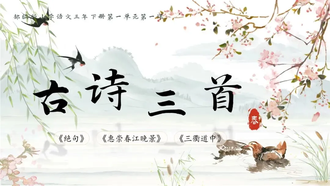 2.过渡:读古诗,我们能从诗人独特的视角中,欣赏到世界非凡的美。今天我们要学的这三首古诗也与季节有关,他们分别是《绝句》《惠崇春江晚景》《三衢道中》,学生齐读,引出新课《古诗三首》。