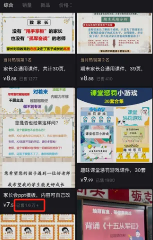 - 爆款款:定价7-10元的中等价位资料(如《7.5元家长会PPT模板》,已售1.6万+;《6.66元毕业季班会课件》),精准解决家长会、毕业季等核心刚性需求,是店铺销量和收入的中流砥柱。