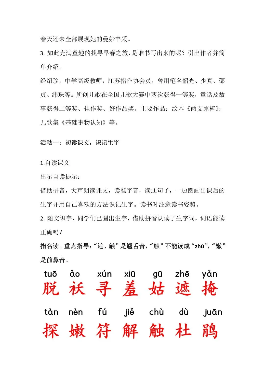 1.同学们,春天是美好的,春天是欢快的,春天是生机勃勃又充满着童趣的,她像个害羞的小女孩,在田野中遮遮掩掩、躲躲藏藏,让我们一起在这节课中踏上寻春之旅,跟着羞答答的春姑娘一起敲开春天的大门吧!课件出示四季美景,让同学们通过图片找寻春天,说说春天和其他季节的不同之处,并简单说出对春天的印象和感受。2.板书课题,全班齐读,引出疑问,春天可以在哪里找到呢?春天完全显露出来了吗?课件出示早春情境,强调找春天为“早春时节”,春天还未全部展现她的曼妙丰采。3.如此充满童趣的找寻早春之旅,是谁书写出来的呢?引出作者并简单介绍。经绍珍,中学高级教师,江苏指作协会员,曾用笔名韶光、少真、邵贞、纬珠等。所创儿歌在全国儿歌大赛中两次获得一等奖,童话及故事获得二等奖、佳作奖、好作品奖。主要作品:绘本《两支冰棒》;儿歌集《基础事物认知》等。