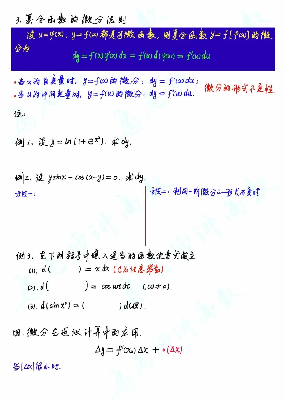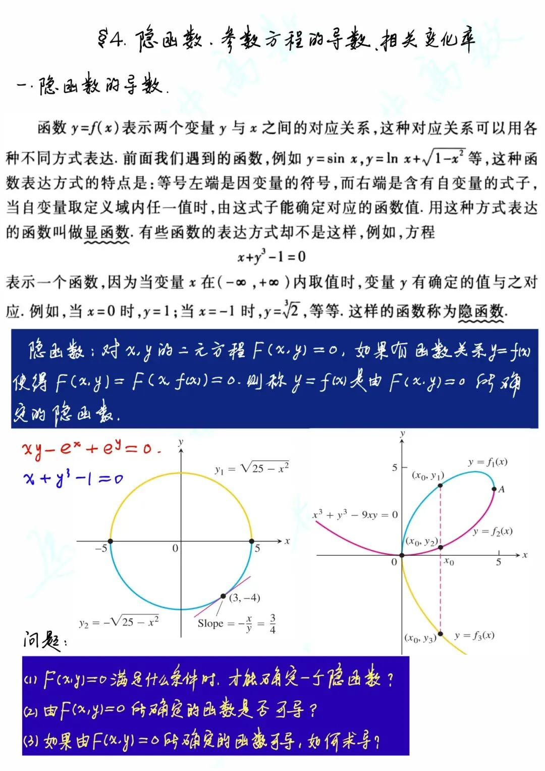 隐函数、参数方程、相关变化率的本质都是链式法则的应用。它们解决了当变量关系不是简单的 y=f(x) 时,如何求导的问题。微分则是从另一个角度(改变量)理解导数,并为其提供了强大的应用工具(近似计算)。