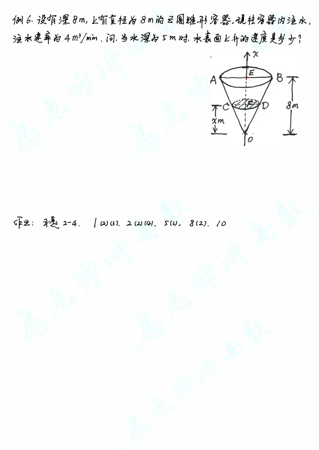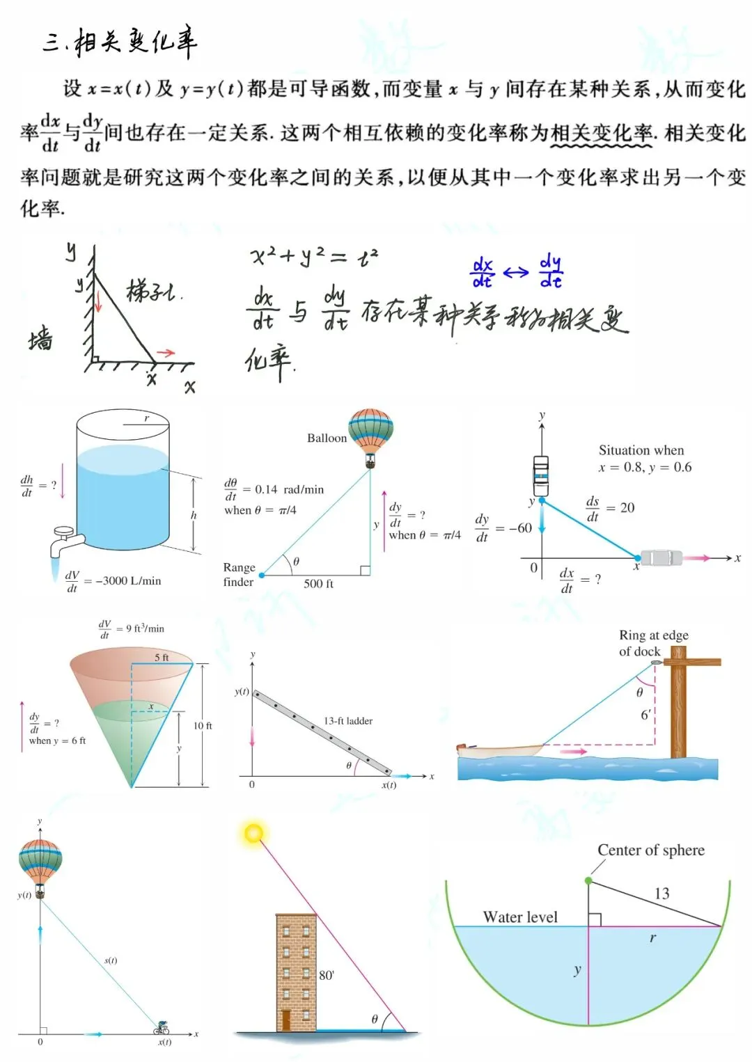 3、相关变化率:这是应用题,难点在于第一步(建立关系)。多刷几种类型的题(如几何、物理问题),熟悉常见模型(球体积、圆锥体积、勾股定理等)。养成“先找关系,再求导”的习惯。