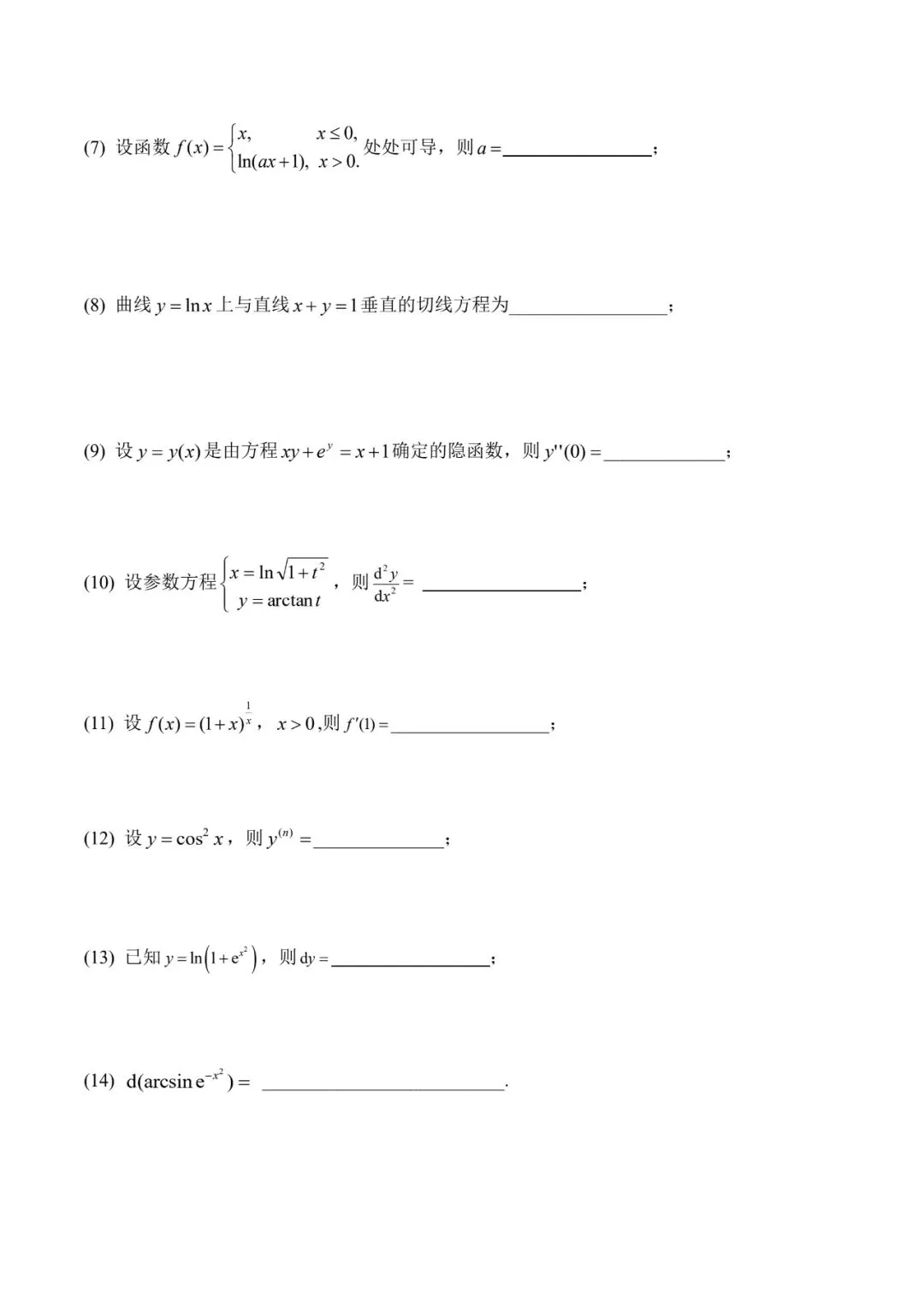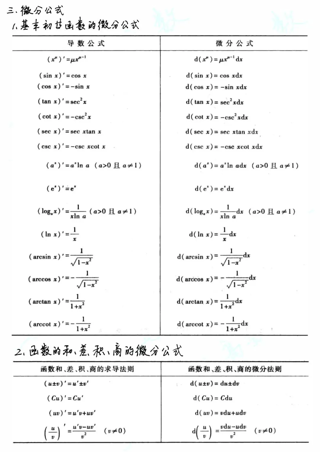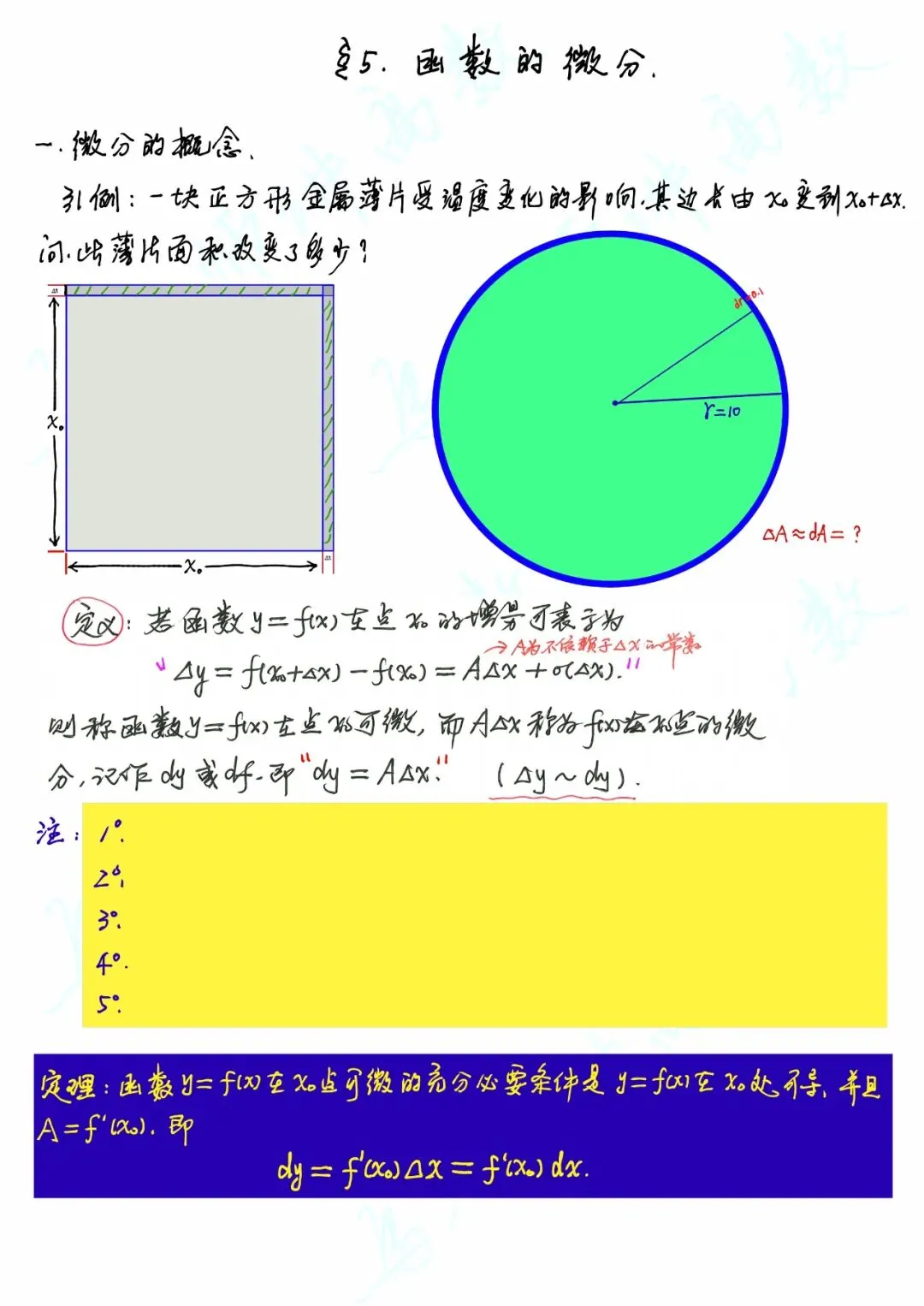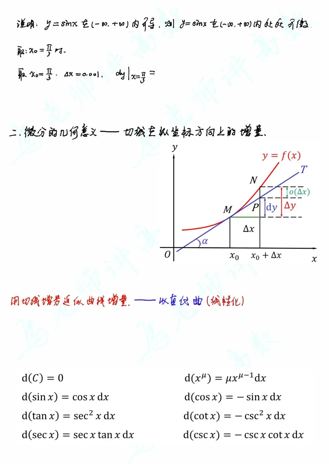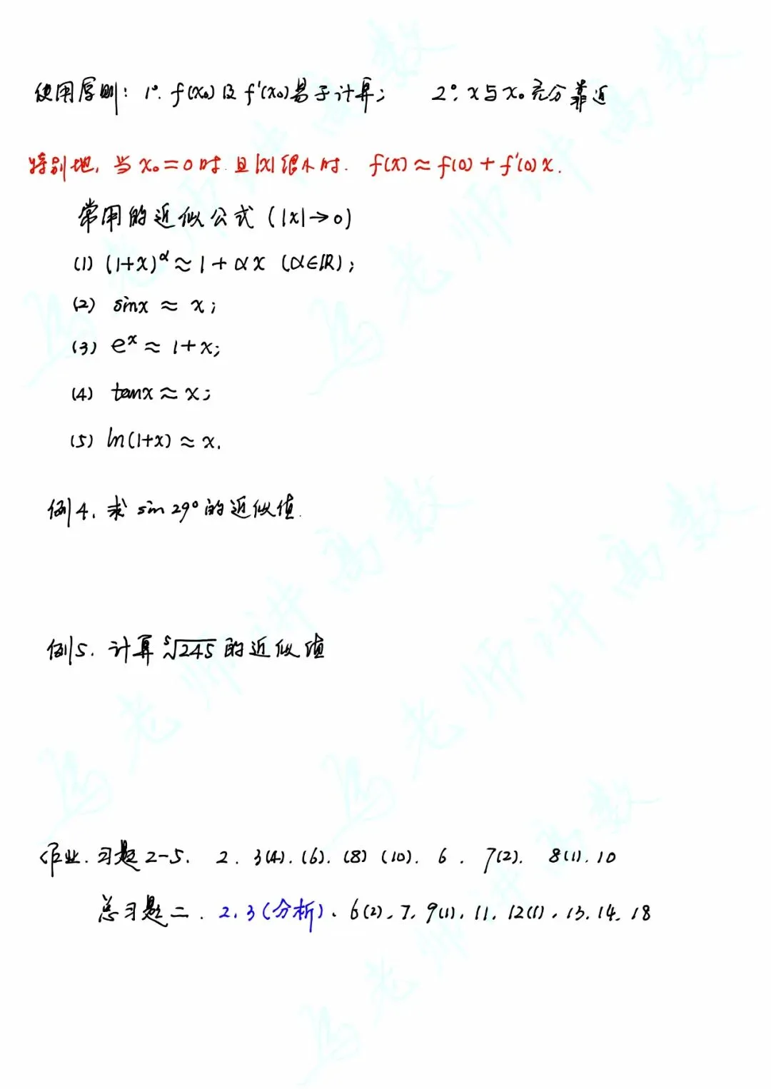 4、函数的微分:理解其几何意义。熟练运用近似计算公式 f(x) ≈ f(x₀) + f'(x₀)(x - x₀),并记住几个常见函数的近似公式(如 (1+x)^α ≈ 1+αx, sin x ≈ x 等)。