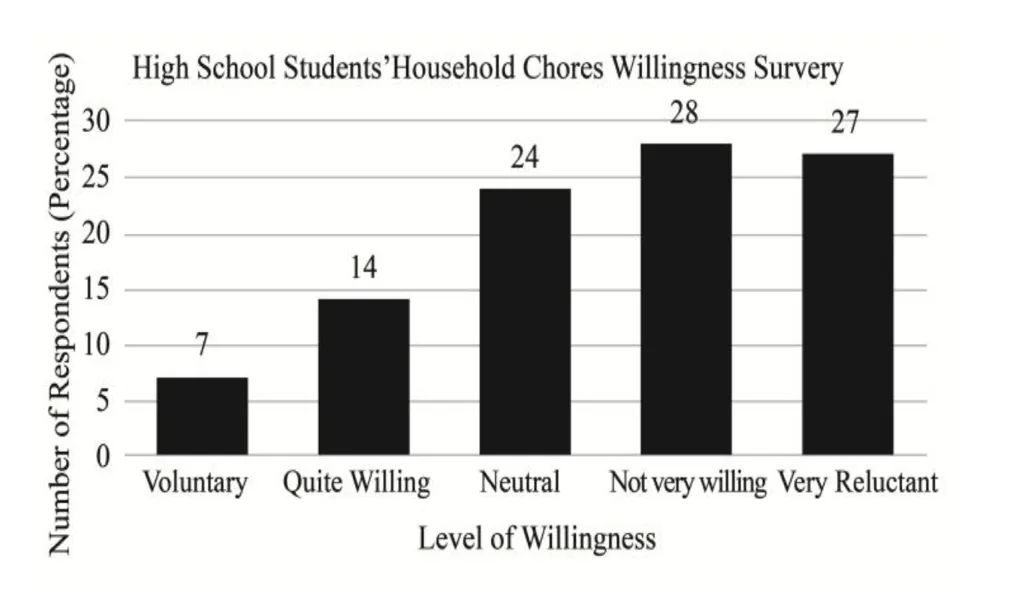 Hi everyone! I just checked out the survey about high students’ willingness to do household chores. Interestingly, merely 7% of us are taking on chores voluntarily, while nearly 60% feel not very willing or even reluctant. This result clearly reflects a general lack of enthusiasm for doing housework.