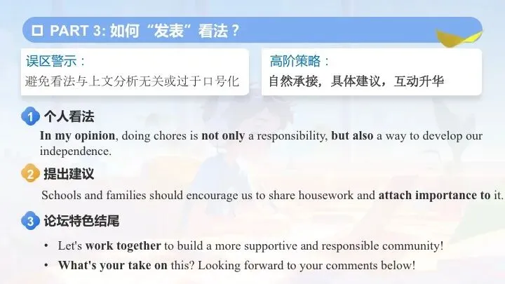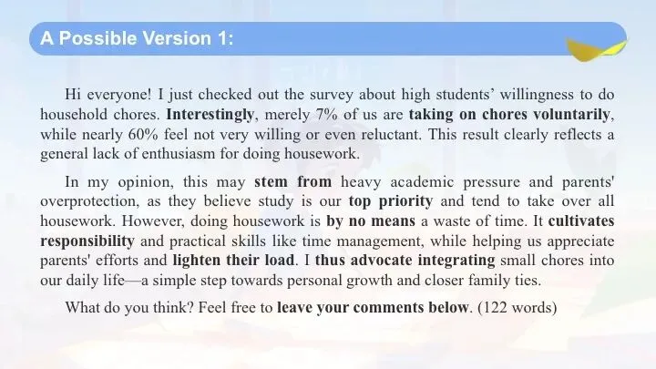 In my opinion, this may stem from heavy academic pressure and parents' overprotection, as they believe study is our top priority and tend to take over all housework. However, doing housework is by no means a waste of time. It cultivates responsibility and practical skills like time management, while helping us appreciate parents' efforts and lighten their load. I thus advocate integrating small chores into our daily life—a simple step towards personal growth and closer family ties.