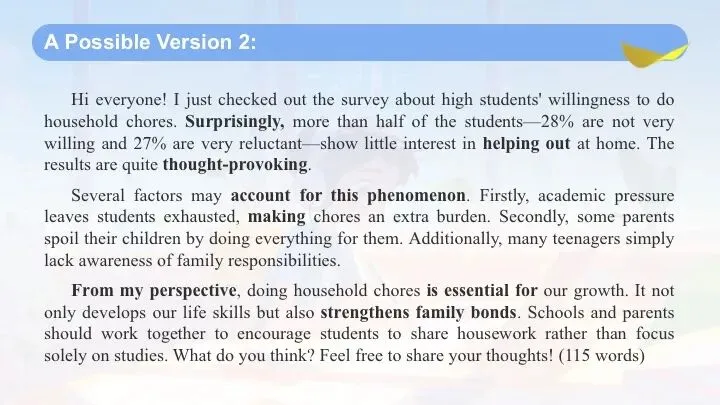 From my perspective, doing household chores is essential for our growth. It not only develops our life skills but also strengthens family bonds. Schools and parents should work together to encourage students to share housework rather than focus solely on studies. What do you think? Feel free to share your thoughts! (115 words)