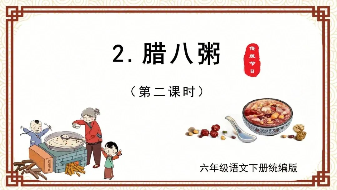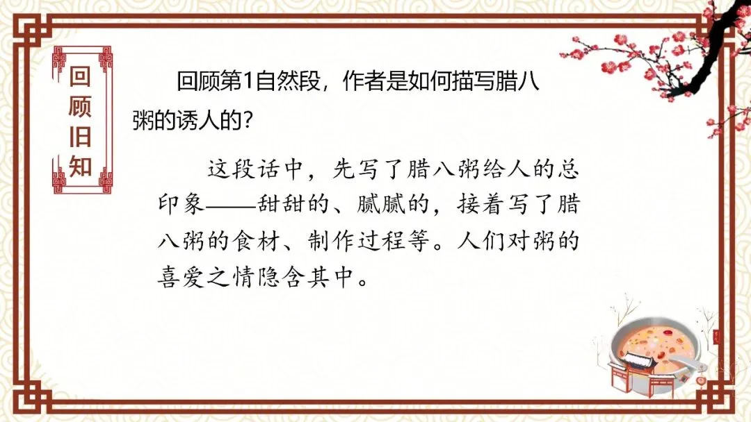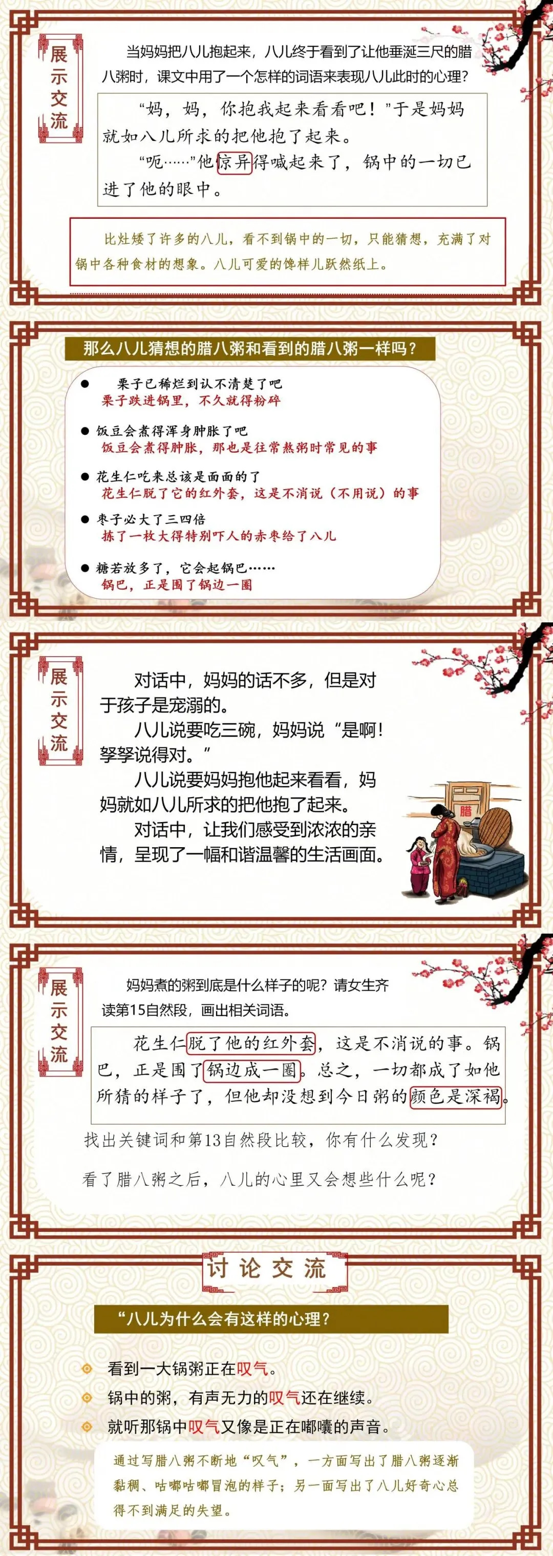 (7)小结:喝腊八粥是我国传统节日腊八节的风俗。作者不仅写了八儿期盼、喜爱腊八粥,其实他更想写出的是所有中国人对腊八粥的期待、喜爱。