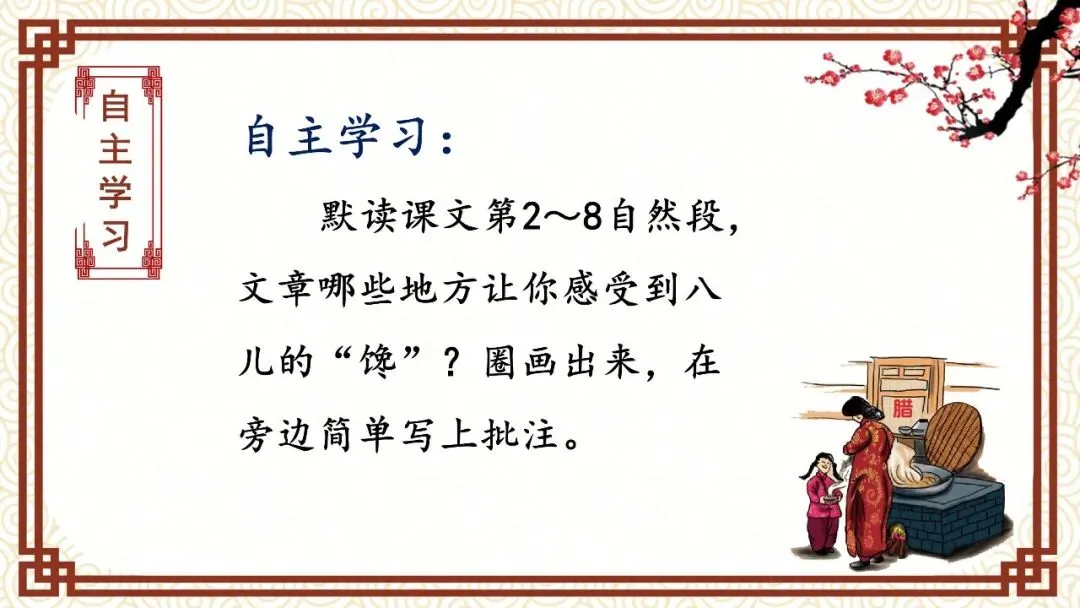 默读课文第2~8自然段,文章哪些地方让你感受到八儿的“馋”?圈画出来,在旁边简单写上批注。