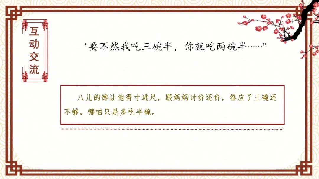 这儿的语言描写,体会出腊八粥虽然还在锅里叹气,八儿却已经充满了期待。他已经在心里为全家人分好了粥。大哥同爹都吃不得甜的,他正好借机可以多吃两碗,展现了孩子的天真童趣。我们仿佛已经看到了八儿那窃喜的表情。怕妈妈不答应,又为妈妈也安排了吃三碗,连续两句“吃三碗”,小孩子的馋样儿跃然纸上。