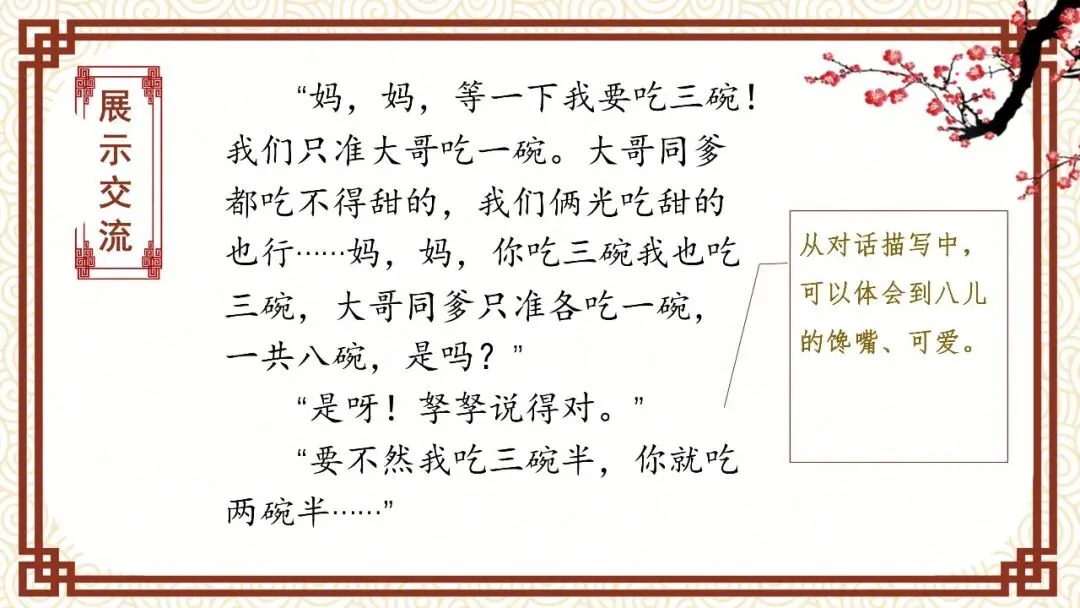 ②对话中,妈妈的话不多,但是对于孩子是宠溺的。八儿说要吃三碗,妈妈说“是啊!孥孥说得对。”八儿说要妈妈抱他起来看看,妈妈就如八儿所求的把他抱了起来。对话中,让我们感受到浓浓的亲情,呈现了一幅和谐温馨的生活画面。