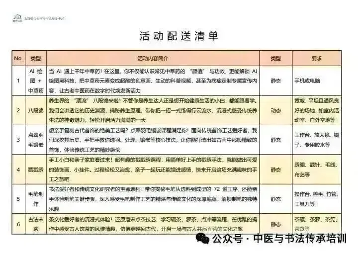 以下系专配送各类活动和项目的清单