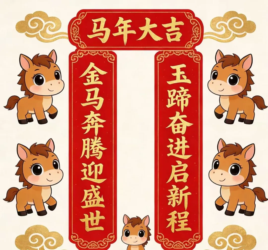 1. 场景联结:出示马年春联、福字图片,搭配新年音乐(如《新年好》片段),说:“2026年是马年,新年到啦,到处都是马的图案,我们要过马年啦!” 用红黄色装饰图营造喜庆氛围,让孩子感知“新年”与“马”的关联。