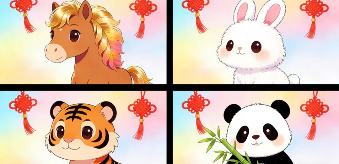 2. 简单对比:若孩子有基础认知,可出示其他生肖(如兔、羊)的简单图片,说:“去年是兔年,今年是马年,马年有小马的祝福”,帮助孩子建立“年份与生肖”的初步概念(难度可降低,重点在“马年=今年”)。