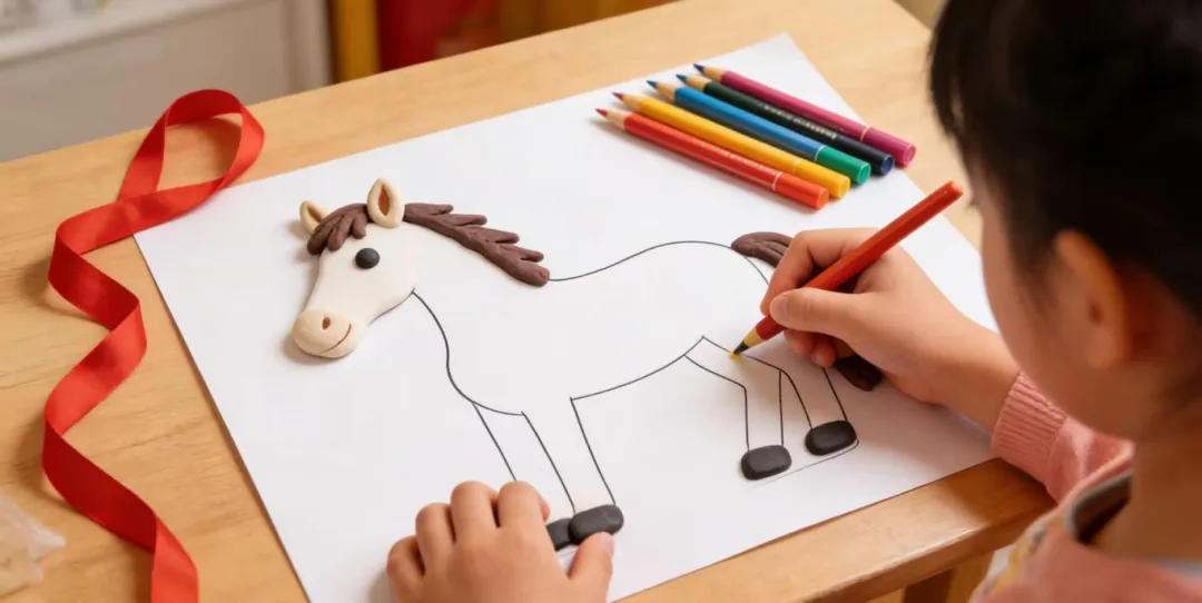 3. 情感强化:孩子完成作品后,一起展示,说:“这是宝贝做的马年小马,真漂亮!马年要像小马一样有力量,开开心心!”