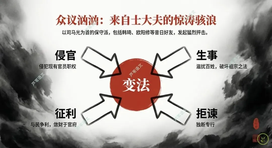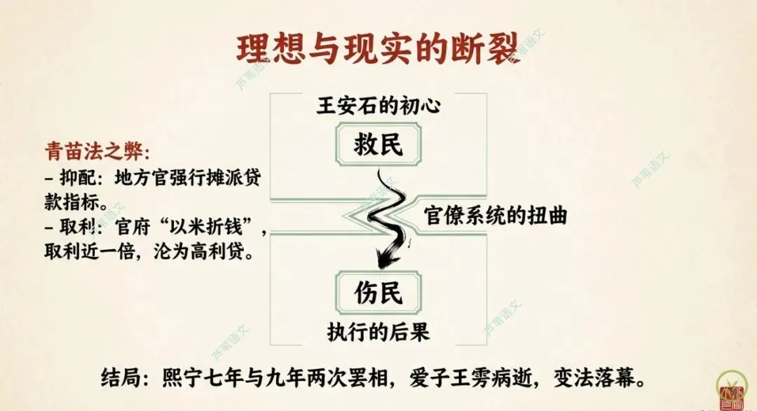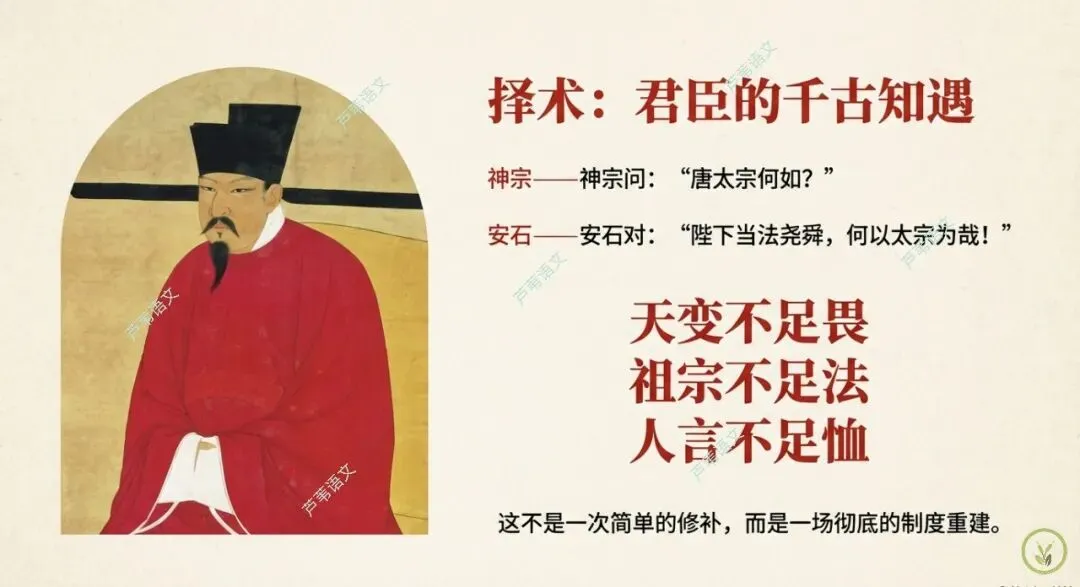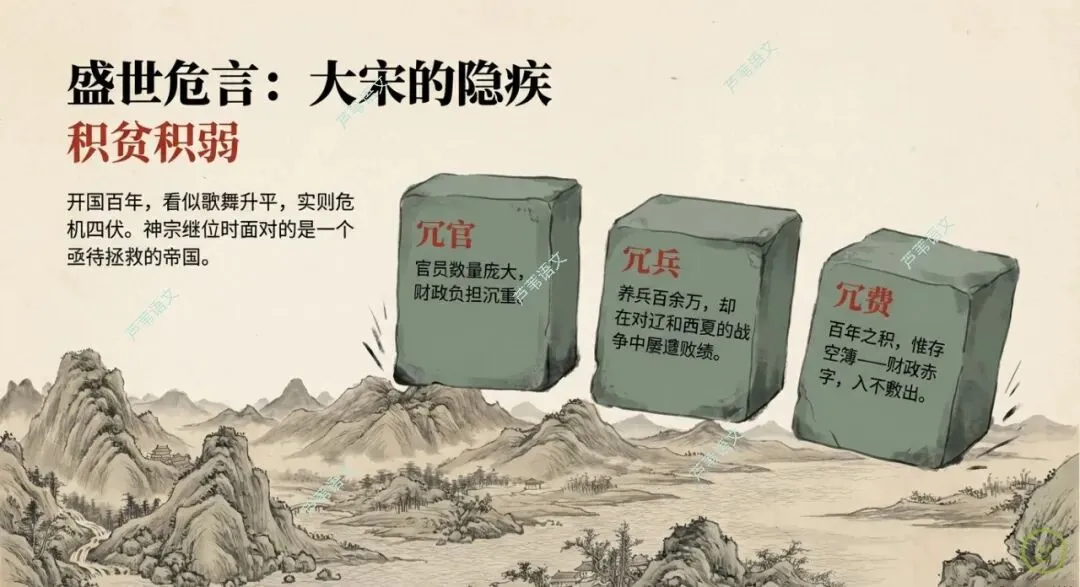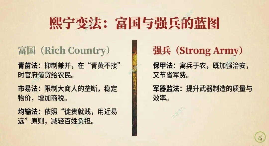 * 变法核心:在宋神宗支持下,针对北宋“积贫积弱”的局面推行“熙宁变法” 。