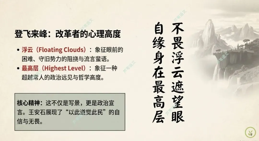 * 哲理意蕴:《登飞来峰》将自然景观与政治远见结合,体现了不畏艰难的进取精神 。