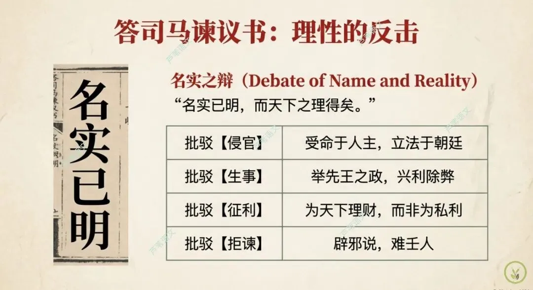 * 代表作:《答司马谏议书》,体现了其不因循守旧、变法图强的政治立场和锐利的论辩精神 。