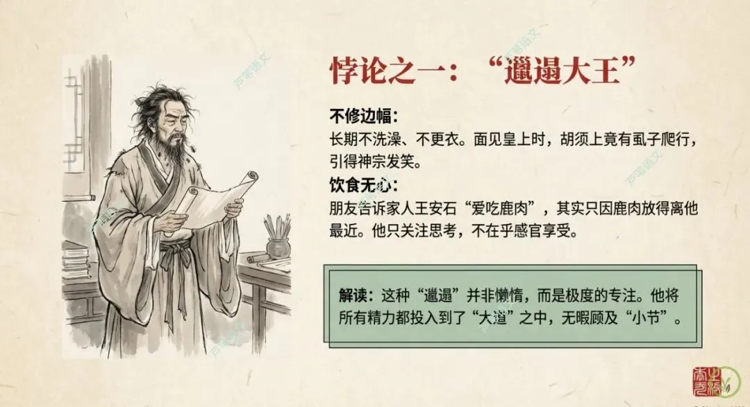 * 邋遢大王:他不爱洗澡,不理发,不讲究个人卫生,甚至在面见神宗时胡须上爬过虱子 。