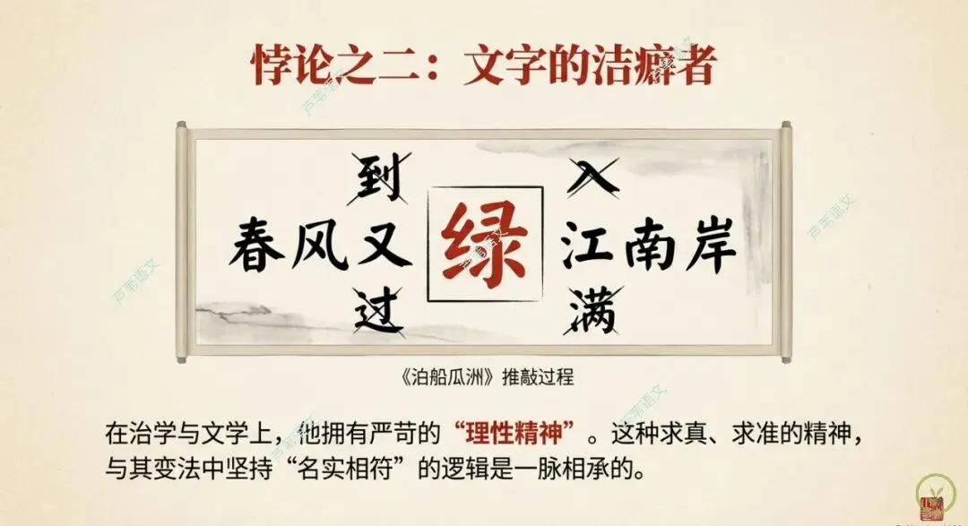 * 炼字典范:“春风又绿江南岸”中的“绿”字经十数次修改,成为千古佳话 。