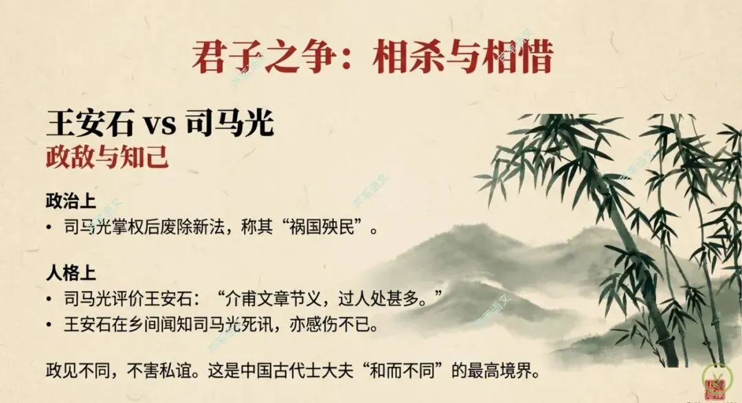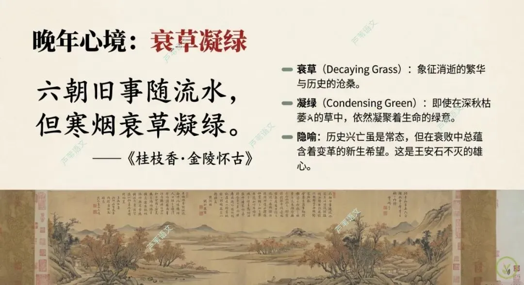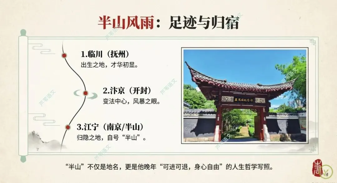 * 进退之间:晚年自号“半山”,寓意人生既要向上攀登(进取、兼济天下),也要能转身下坡(退守、独善其身) 。