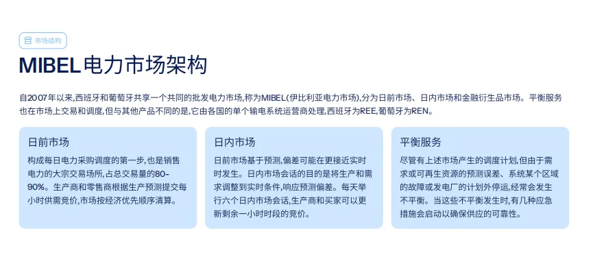 研究首先梳理了能源转型背景:可再生能源渗透提升导致系统灵活性需求增加,VPP 作为分布式能源(DER)聚合载体,整合分布式电源、储能等资源,成为解决系统不平衡的关键路径。随后以伊比利亚电力市场(MIBEL)为案例,分析其市场结构(日前、日内、平衡服务市场)及监管框架,明确 VPP 多市场参与的约束条件。