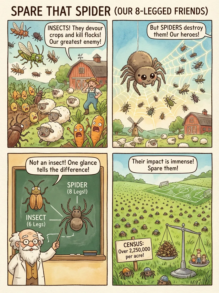 Why, you may wonder, should spiders be our friends? Because they destroy so many insects, and insects include some of the greatest enemies of the human race. Insects would make it impossible for us to live in the world; they would devour all our crops and kill our flocks and herds, if it were not for the protection we get from insect-eating animals. We owe a lot to the birds and beasts who eat insects but all of them put together kill only a fraction of the number destroyed by spiders. Moreover, unlike some of the other insect eaters, spiders never do the least harm to us or our belongings.