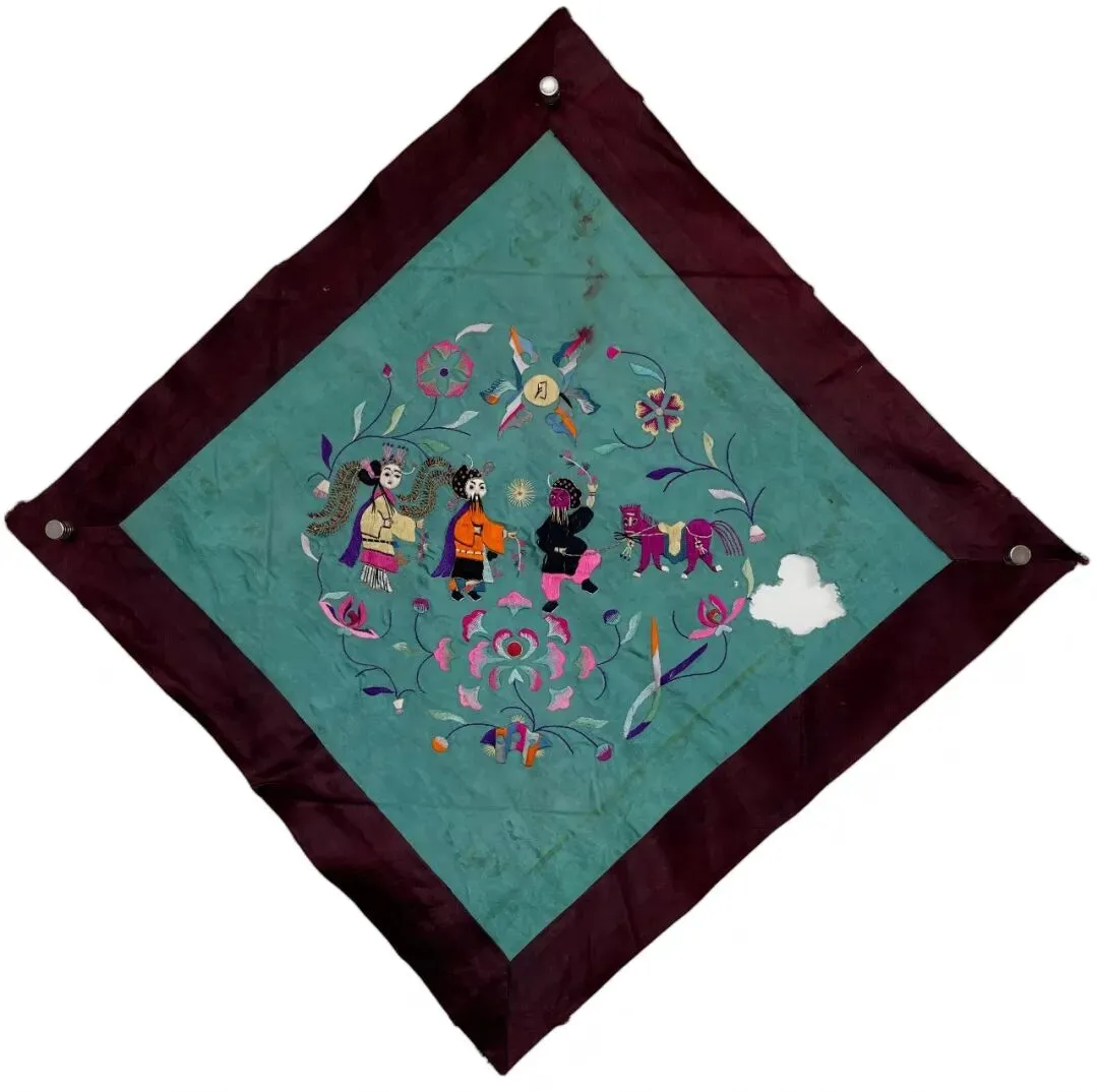 从色彩上看,绣品搭配大胆且巧妙,缎底的底色沉稳庄重,纹样的色彩鲜艳明快,形成鲜明的对比,凸显出图案的立体感与层次感。整体风格兼具写实与写意之美,既忠实地还原了戏剧场景,又融入了民间绣工的创意与想象,承载着特定时代的文化记忆与民间艺术的智慧结晶,是传统刺绣艺术与戏剧文化完美结合的珍贵产物。