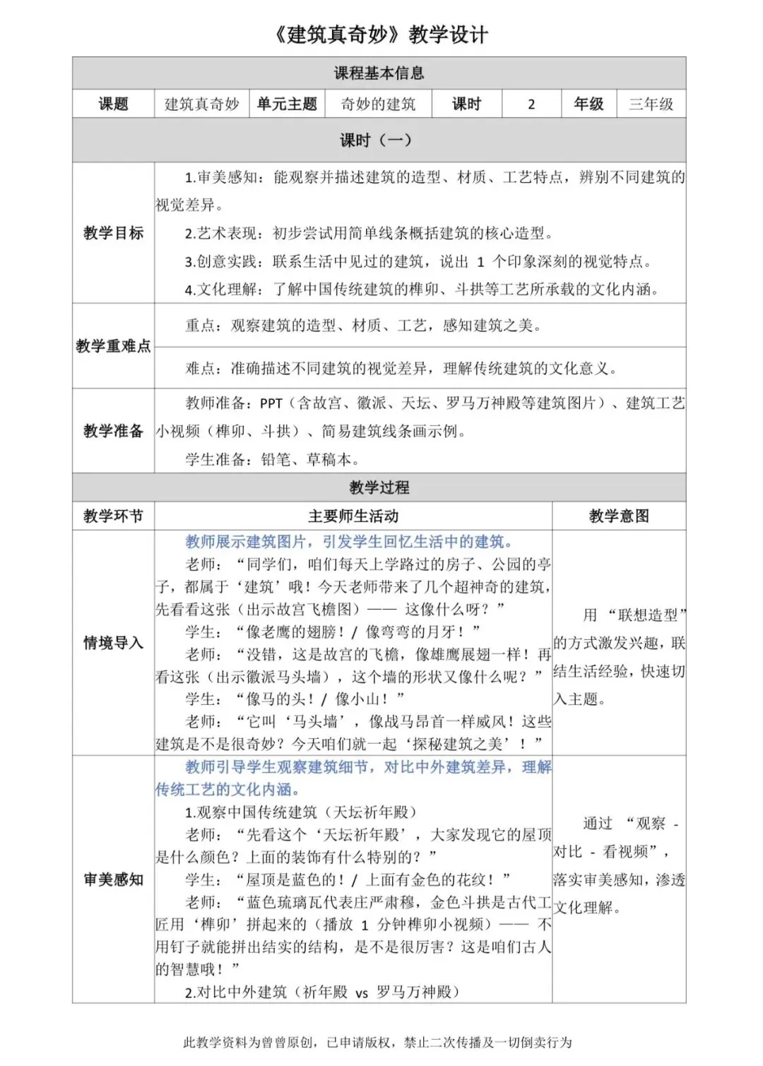 各单元课型搭配合理,每单元 3 节课层层递进,如 “奇妙的建筑” 单元从线条表现建筑,到结合生物特征创意设计建筑,再到欣赏经典建筑并体验搭建;“荷塘故事” 单元从单一水墨青蛙绘制,到水墨荷花表现,再到荷塘整体构图创作,实现了 “技能学习 — 创意应用 — 综合表达” 的提升,符合美术学习的连续性和进阶性要求。